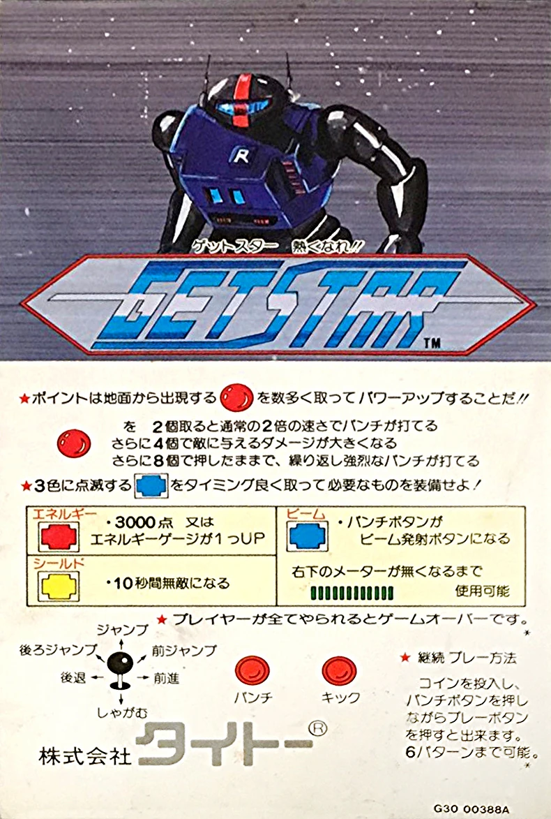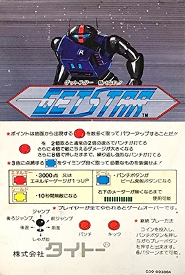 Guardian, also known as Get Star (ゲットスター), is a side-scrolling action game developed by Toaplan and released in 1986 for Arcades. In 2021 it was included as a bonus DLC in the Ultimate Tiger-Heli compilation by M2. Outside of Japan, the game was licensed to KitKorp for US distribution.